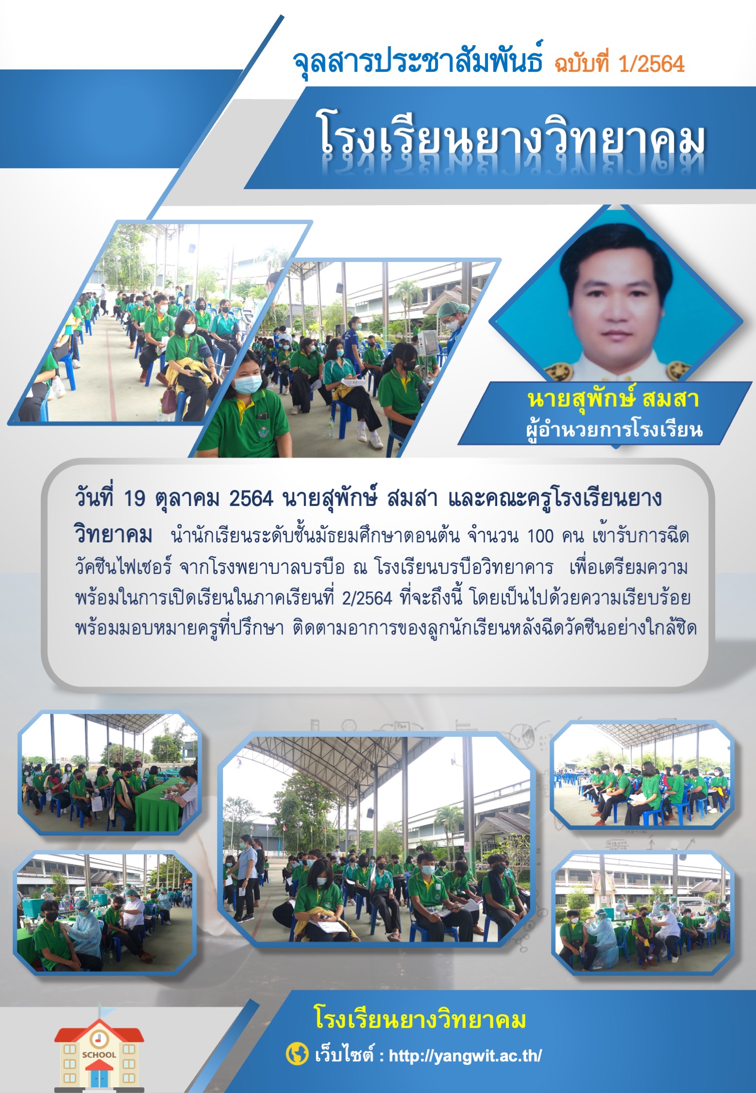 วันที่ 19 ตุลาคม 2564 นายสุพักษ์ สมสา และคณะครูโรงเรียนยางวิทยาคม  นำนักเรียนระดับชั้นมัธยมศึกษาตอนต้น จำนวน 100 คน เข้ารับการฉีดวัคซีนไฟเซอร์ จากโรงพยาบาลบรบือ ณ โรงเรียนบรบือวิทยาคาร  เพื่อเตรียมความพร้อมในการเปิดเรียนในภาคเรียนที่ 2/2564 ที่จะถึงนี้ โดยเป็นไปด้วยความเรียบร้อย พร้อมมอบหมายครูที่ปรึกษา ติดตามอาการของลูกนักเรียนหลังฉีดวัคซีนอย่างใกล้ชิด